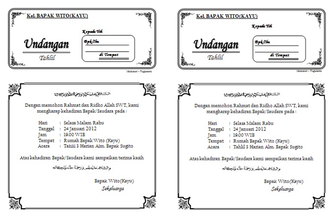 Contoh undangan tahlil diatas siap anda edit sesuai dengan kebutuhan yang diperlukan. Contoh undangan tahlil diatas siap anda edit sesuai dengan kebutuhan yang diperlukan. Pak hans yang berasal dari luar pulau itu heran. Setelah misa selesai, ketua lingkungan mengumumkan bahwa besok sore ada misa arwah lagi, yakni misa satu tahunnya ibu sastra. 19:00 wib 11 p :